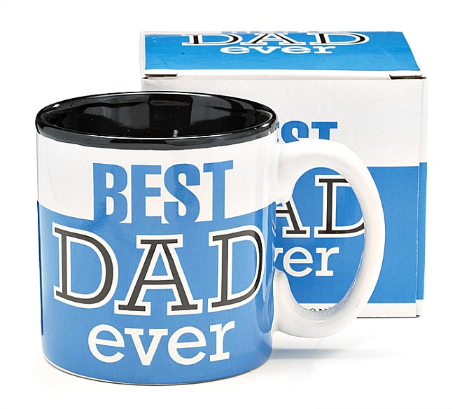 Wide blue band around with "Best Dad Ever" message on Ceramic Mug with black interior. Includes printed gift box. Holds 13 oz. Dishwasher and Microwave Safe.