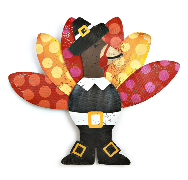 Tuxedo Turkey Door Hanger from Silvestri Screenings by Artist Peri Woltjer. This colorful hand-painted aluminum screen features a Colorful Turkey wearing a Pilgrim Tuxedo, Hat and Boots. Perfect for your outside door or inside wall. Measures 27"W x 24.5 H.
